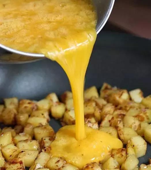 2.將土豆切成小塊用油煎熟,倒入雞蛋液沒過土豆。