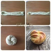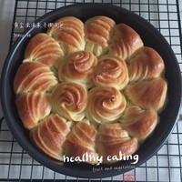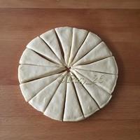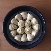 11 把卷好的麵糰放入8寸圓模,中間放4個,其他的在邊上排成一圈,放溫暖處發酵至兩倍大