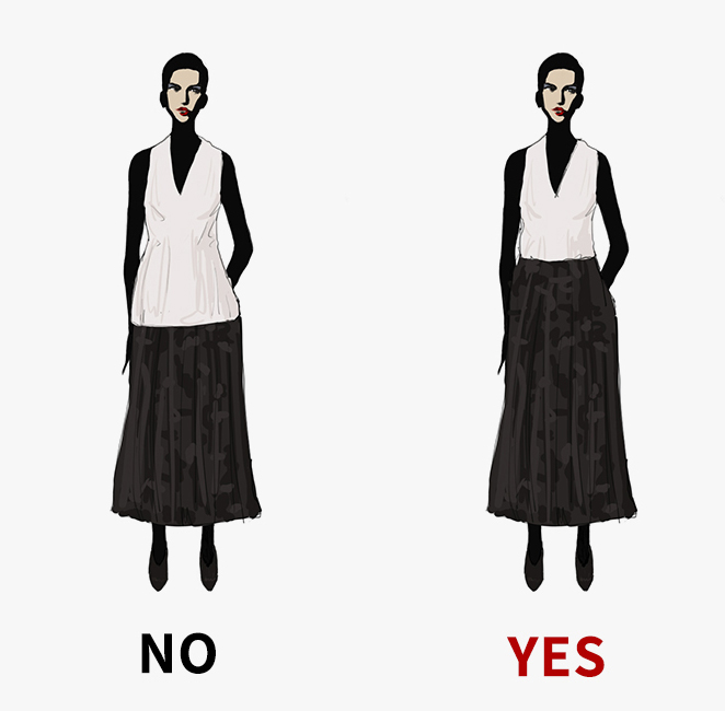 不長不短最尷尬,小腿粗的千萬別穿中裙。超長裙製造的視覺縱深感是驚人的,不要怕拖沓感什麼的,遮住腳面最佳。