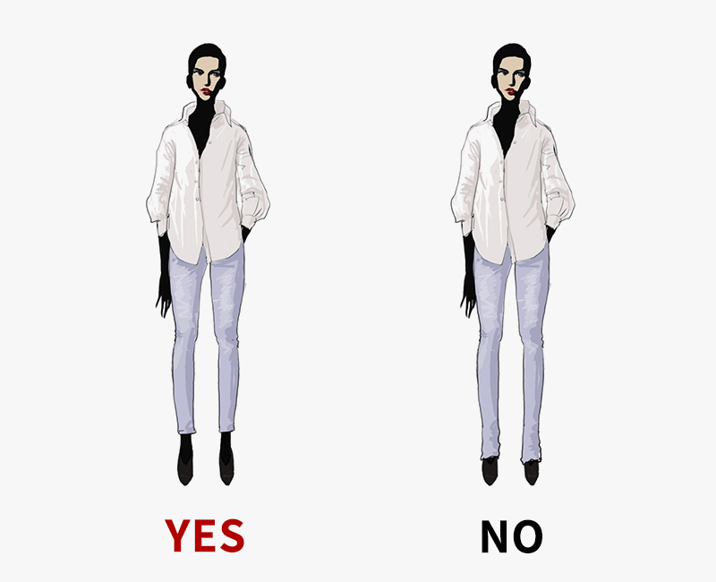 把纖細的腳踝露出來會讓你的腿部也顯得纖細些,長褲可以適當將褲腳部分翻卷,小小的心機讓你顯得更纖瘦!穿平底鞋時更要記得這麼做!