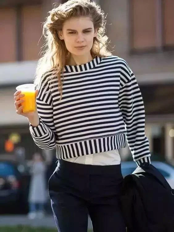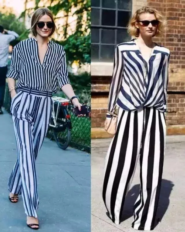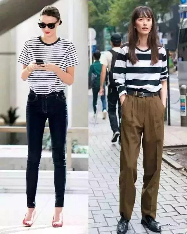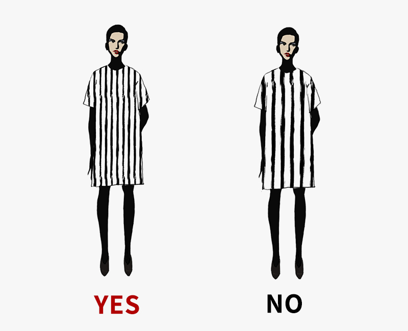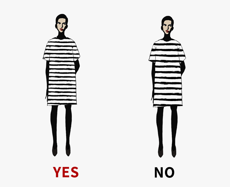 對比可以發現,細條紋會比寬條紋更顯瘦!所以「橫條紋顯胖「的說法也不完全正確,這得看是寬條紋還是細條紋。