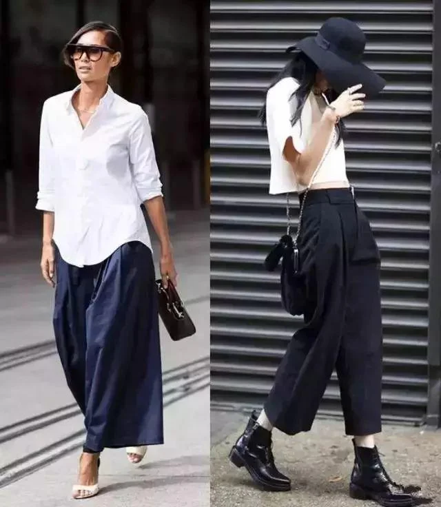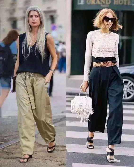 闊腿褲之所以有修飾身材的作用,其中一點就是以為它的線條延展性,左圖里闊腿褲本開就寬鬆,上身還穿了寬鬆的上衣,整體造型都松松垮垮,肯定不好看啊!