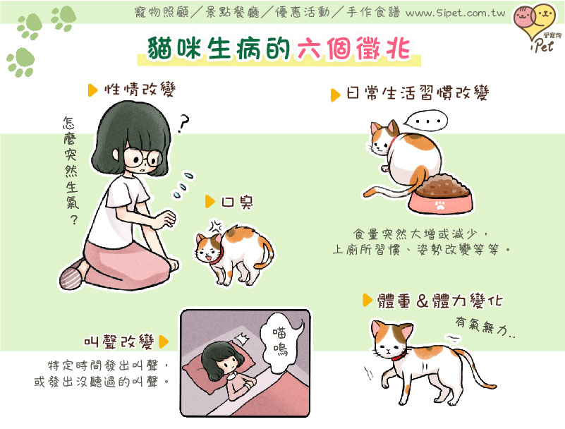 貓咪是很能忍痛的動物,因此在生病初期幾乎無法察覺,等到表現在行為上時,往往已非常嚴重。 除了平時養成觀察與觸摸毛寶貝的習慣,並定期健康檢查外,若貓咪出現以下徵兆,就須多加留意,必要時可請醫師檢查。 ◎ 日常生活習慣改變 ◎ 貓咪突然改變平常的生活習慣,如進食地點與姿勢改變、食量與理毛次數大增或減少、步伐怪異等,都是貓咪不舒服的徵兆,可能罹患了關節或腸胃疾病。 若貓咪多喝多尿、突然在貓砂盆以外的地方便溺、或上廁所姿勢怪異等,則可能代表泌尿與腎臟疾病,建議立刻就醫檢查。 ◎ 性情改變 ◎ 若毛寶貝忽然改變對家人的態度,從活潑開朗的個性變得安靜、愛躲起來,或平時溫和卻冷不防變兇,都可能是因為疼痛、不舒服所致。 ◎ 體力變化 ◎ 貓咪平均一天約需 16~18 小時的睡眠,若發現毛寶貝睡覺時間改變,或活動力變差、行動緩慢等,就可能是生病的徵兆。 有些高齡貓亦會出現上述狀況,建議毛主人多觀察有無其他徵兆,以正確判斷情況。 ◎ 口臭 ◎ 若毛寶貝嘴巴臭臭的,可能是罹患牙周病、口腔感染、蛀牙等,有時消化不良,使食物在胃中停留時間過長,也會導致口臭發生。 ◎ 體重改變 ◎ 即使是刻意節食或增胖,貓咪的體重都不應快速變化,若毛寶貝身型明顯遽增或驟減,有可能是口腔、消化疾病,或胸腹腔內有液體累積所造成。 ◎ 叫聲改變 ◎ 若貓咪會在特地的時間地點叫,如半夜喵喵叫、對著飼料叫卻不進食等,或是突然出現陌生的叫法,可能是因為疼痛所致,建議多觀察幾天,若貓咪伴隨其他異常行為,就要盡快送醫檢查。