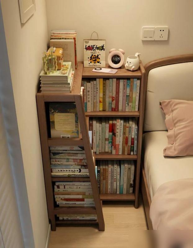 傳統床頭櫃佔半平米地兒只能堆雜物,人家直接把書架豎起來當床頭櫃用——層板能放書、掛籃裝零碎,頂上還能擺綠植。