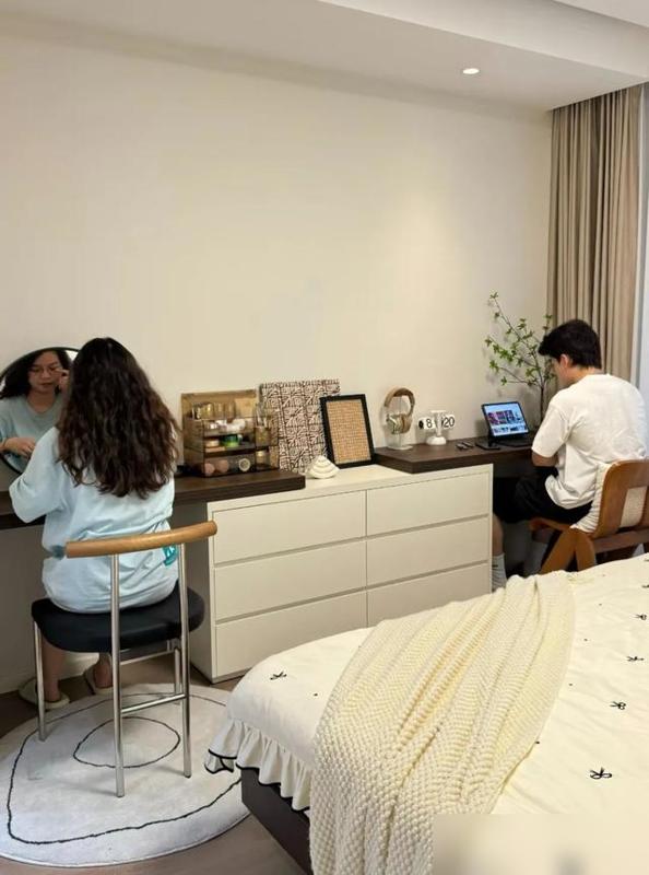 有網友把這招升級成"夫妻桌",雙人書桌中間加個鬥櫃隔間,五平米空間同時兼容辦公和收納,比硬隔出書房聰明多了。