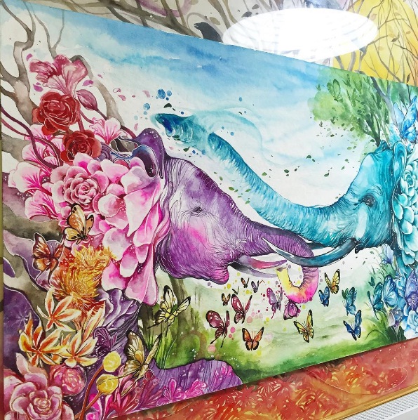 通常水彩都會導致流散的效果,但 Mulyono 的技巧卻完美地將流散出來的顔料混合起來。她有些作品,就好像這張“青龍”,帶出了東南亞的遺產和文化。