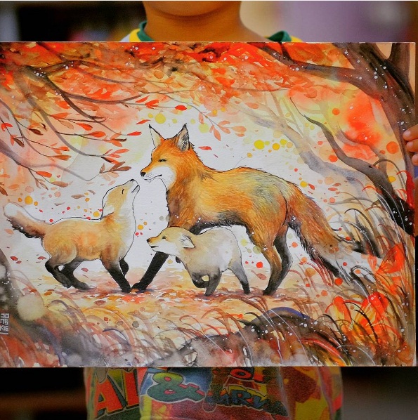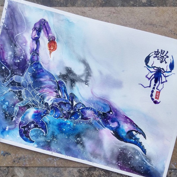 雖然多數的作品都是以大自然和動物爲主題,但它卻遠遠超越了平凡的自然界水彩畫作。這張“蠍子”的顔色以及星形的白色顔料帶出了星座的感覺,令觀衆考慮了宇宙以及昆蟲這兩种不同的角度。