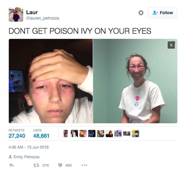 其實Emily接觸到的這種有毒植物:毒漆藤,分佈於產自北美洲,它可長在籬笆上、乾燥的土地裡、和開闊的林地裡。又因為它與一般園林植物無兩異,所以通常難被認出來。一旦人們誤觸它的汁液恐會引起皮膚的過敏反應。