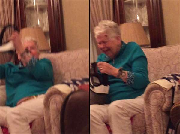 剛開始,頭戴VR裝置的老奶奶先是心平氣和的與家人聊天,