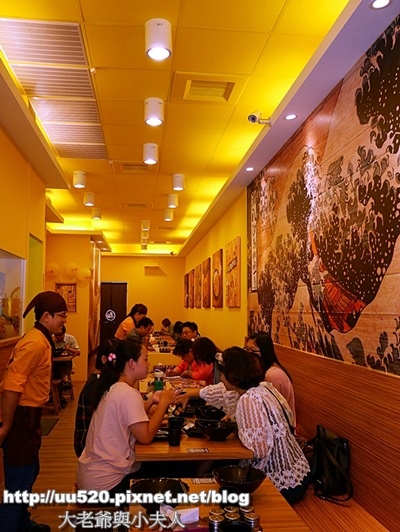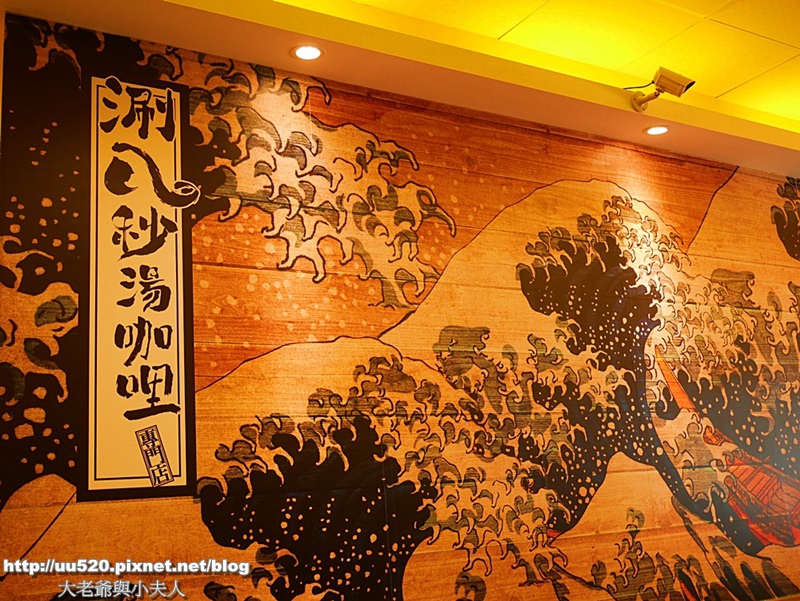 客人之中也有型男上班族(亮點,打馬賽克一下,好像進入日劇的情節中啊...)  靠近門口的牆面上有一大幅日本浮世繪風味的圖, 洶湧澎湃的海浪與浪中的船,令人想起葛飾北齋名作〈神奈川巨浪〉