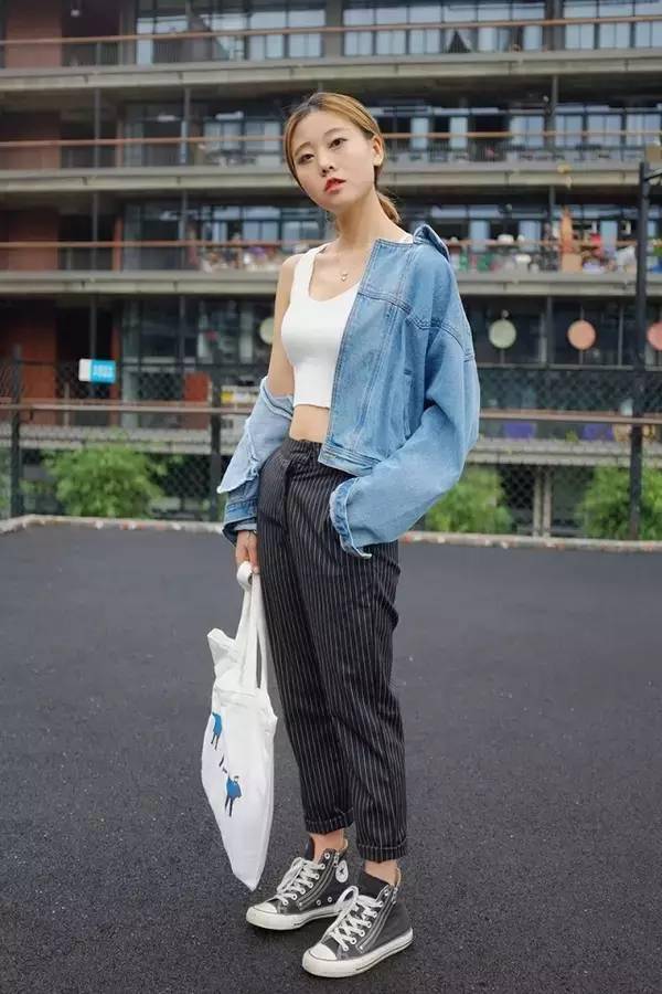 如果你喜歡休閒又隨性的街頭風,那麼你就可以選擇寬鬆的牛仔藍外套,搭配條紋的哈倫褲。配上夏季的短打白背心,舊衣新穿法!