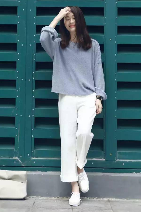 秋天想清新時髦,配色才是關鍵! 燈籠袖套頭針織衫+白褲子