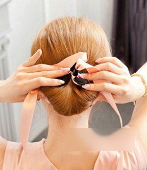 第五步:最後將長長的絲帶系成甜美的蝴蝶結,這款中學女生甜美時尚的盤發就完成了。