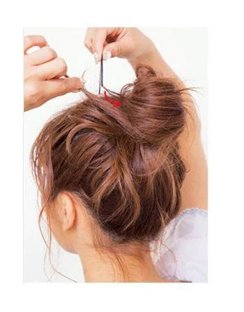 丸子頭髮髻要用手指打理蓬鬆度,發尾則是纏繞在丸子頭髮髻上,用小髮夾將頭髮固定。