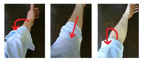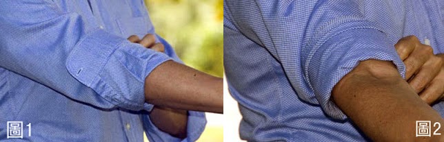 2. 把袖口連袖子反折, 但與前一種相比是拉到約手肘附近,手肘中心約在反折部份的中心 (如下圖1)