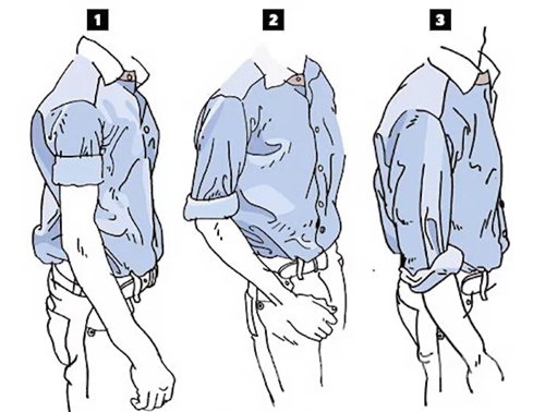 這樣做完的結果應該會停在你前臂的中間部位,這種方式也很適合用在多層次穿搭上,例如:襯衫外加上毛衣, 也很適合手臂細的男性。另外,不建議在辦公室裡把袖子捲起來, 這會讓人覺得你不夠認真. 但相反的, 你假如是主管,開會時希望下屬不要太緊張,也可以稍捲袖子,但注意不要捲太高,高過手肘。(如下圖1)
