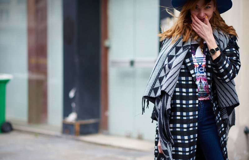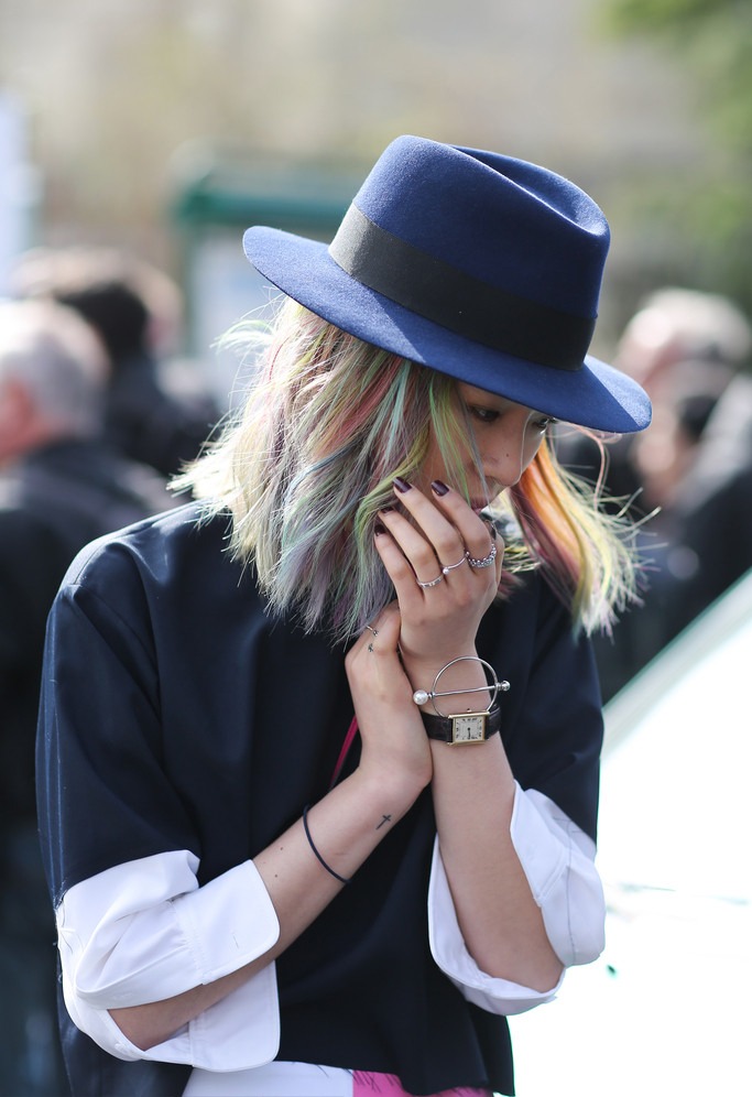 除了中性外,方盤腕錶也會經常出現在街拍中時尚人士的腕間。韓國超模Irene Kim的著裝風格以大膽、混搭為主,將簡約的方盤腕錶與獨特設計的手鐲一同佩戴在腕間,為腕錶的簡約感增添了細節魅力。