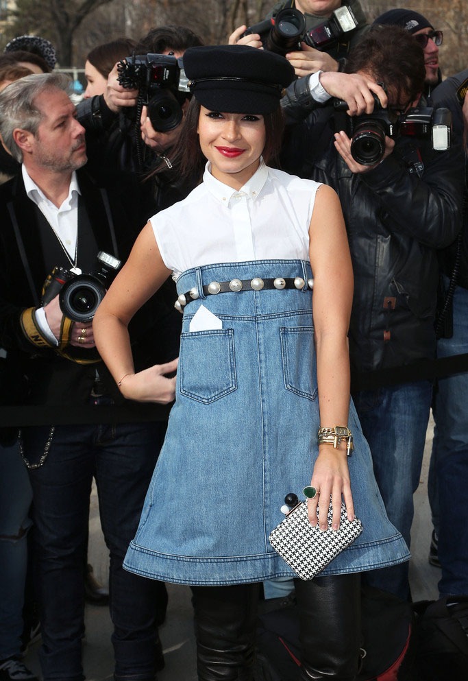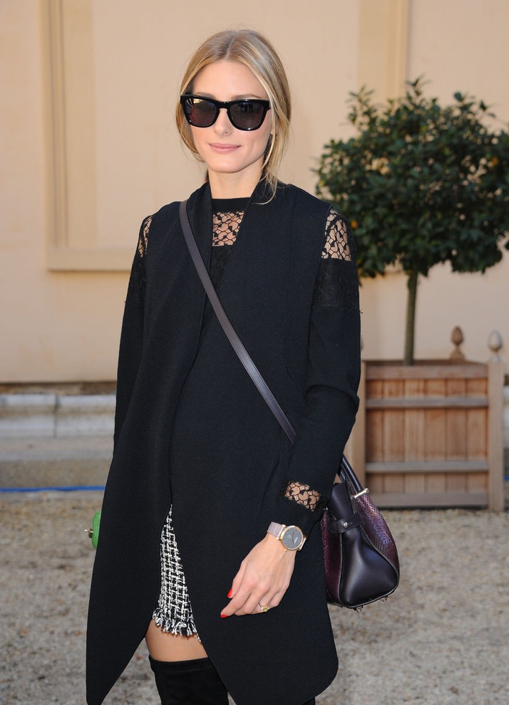 Olivia Palermo身穿黑色鏤空拼接上衣,外搭無袖馬甲,腕間的圓盤腕錶為整體黑色造型增添了一份細節亮點,同時也滿足了整體造型的時髦與優雅。