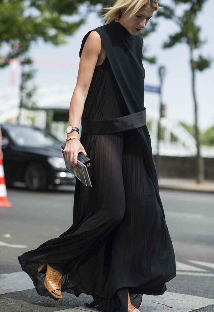 獨特設計的長款黑色連衣裙,腕間搭配一款同色系圓盤腕錶,並與手鐲同時佩戴在手腕上,既符合了整體著裝的統一性,也滿足了優雅且時髦的風格。