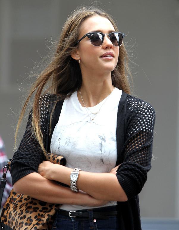 傑西卡·阿爾芭(Jessica Alba)身穿T恤搭配針織外套與牛仔褲,休閒裝扮同樣可以與鏈條表搭配,展現出腕間細節魅力的同時,也盡顯混搭風格。