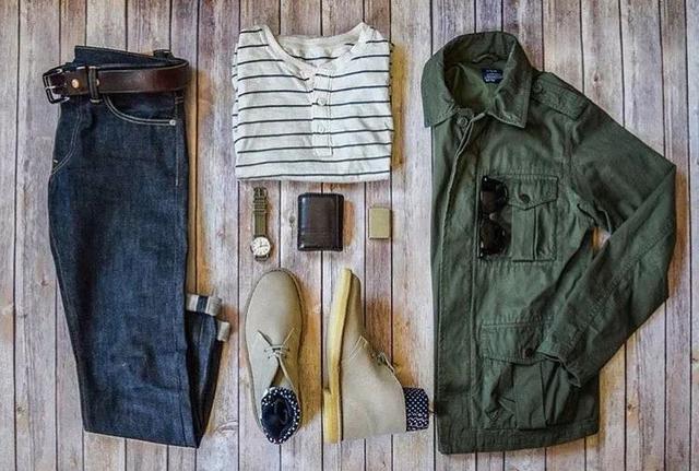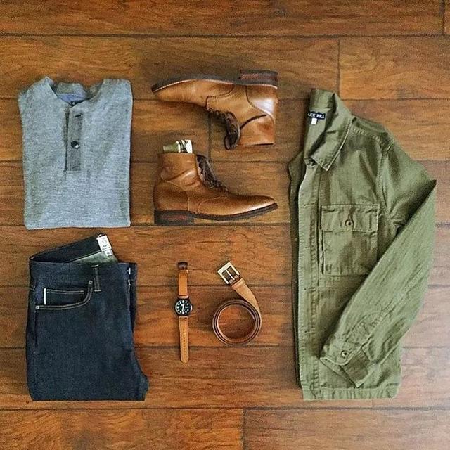 軍綠色工裝外套+ 灰色圓領長袖衫+深藍色直筒牛仔褲+ 皮帶+手錶