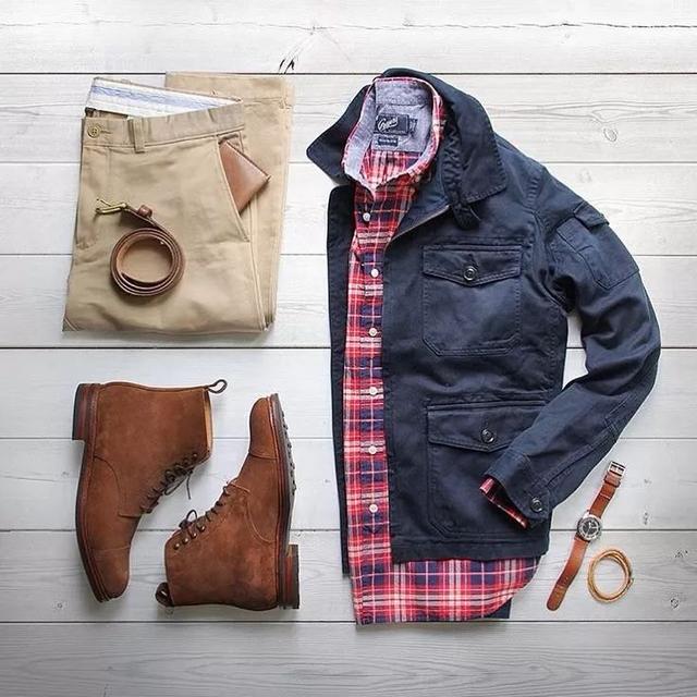 馬丁靴+卡其色休閒西褲+ 皮帶+手錶+ 格紋長袖襯衫+ 藏青色工裝外套