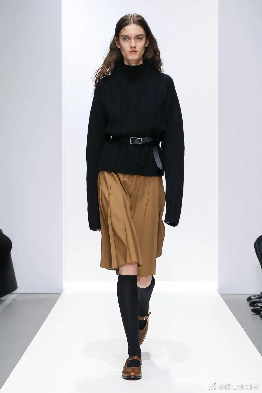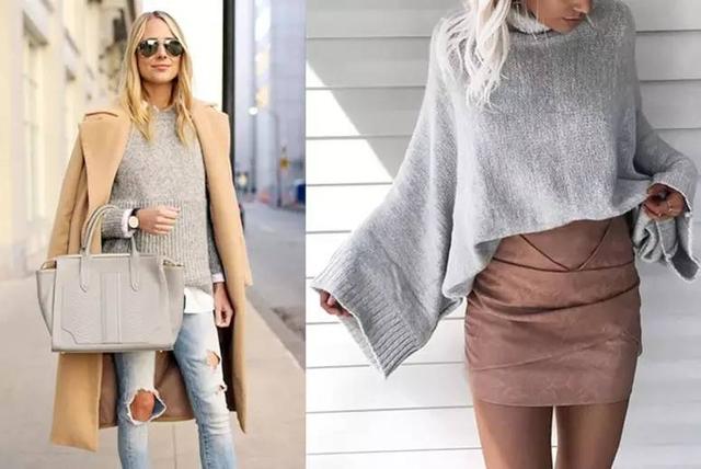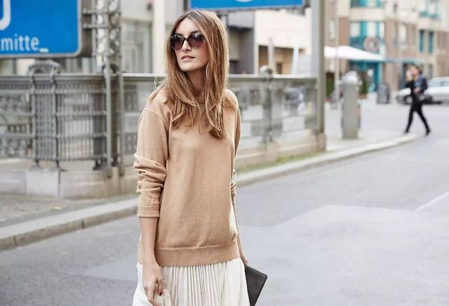 然後就是駝色圓領毛衣,這類毛衣通常不會太厚,所以秋天搭配各類半裙單穿就很好看。