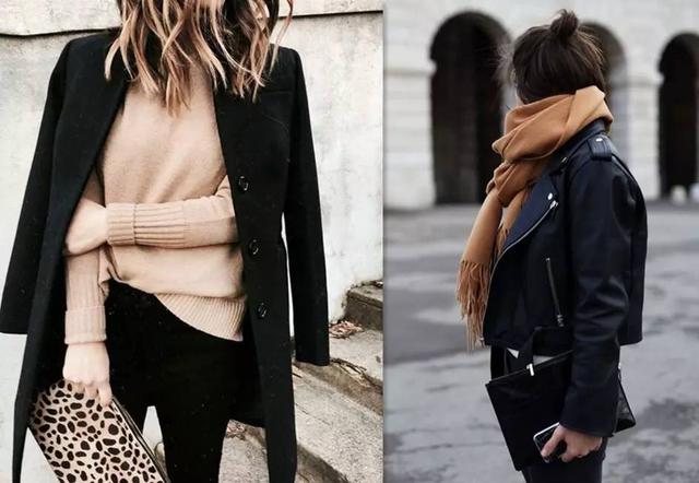 如果是顏色類似的衣服,還有一個辦法是讓它不要與臉直接接觸,比如在這個秋冬,你可以加條圍巾,禦寒的同時還能作為點亮造型的裝飾單品。