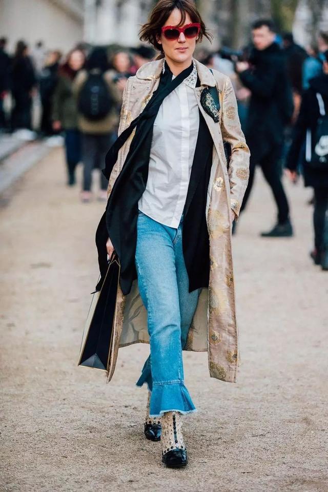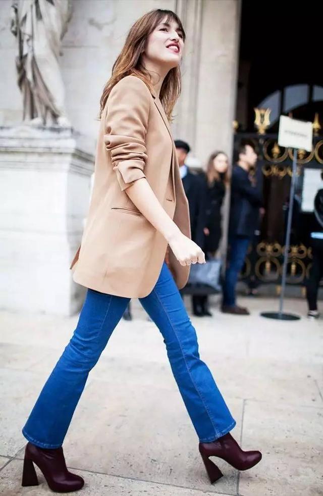 像Jeanne Damas這樣搭配微喇牛仔褲,演繹一種慵懶隨性的復古風情,另外三角形鞋跟的靴子還蠻吸睛。