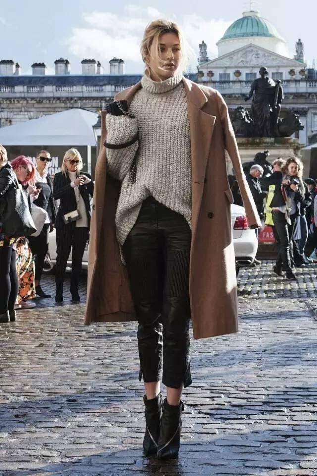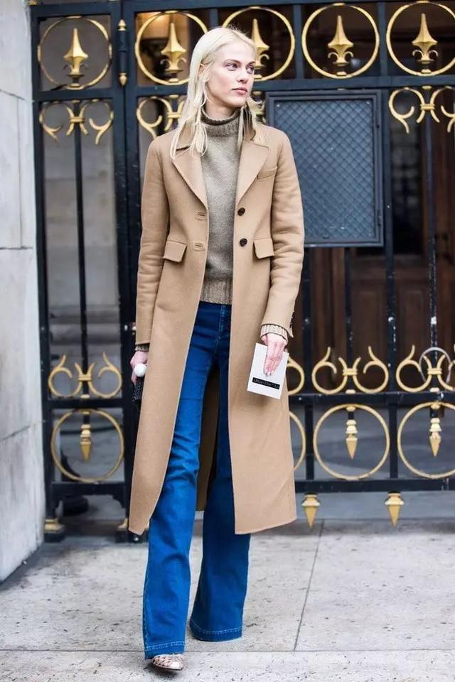 像Aymeline Valade一樣,內搭一件不同顏色的高領毛衣也是駝色大衣的好伴侶,有一種調色板的作用。另外,它也能讓你的造型看起來更復古,更有風格。