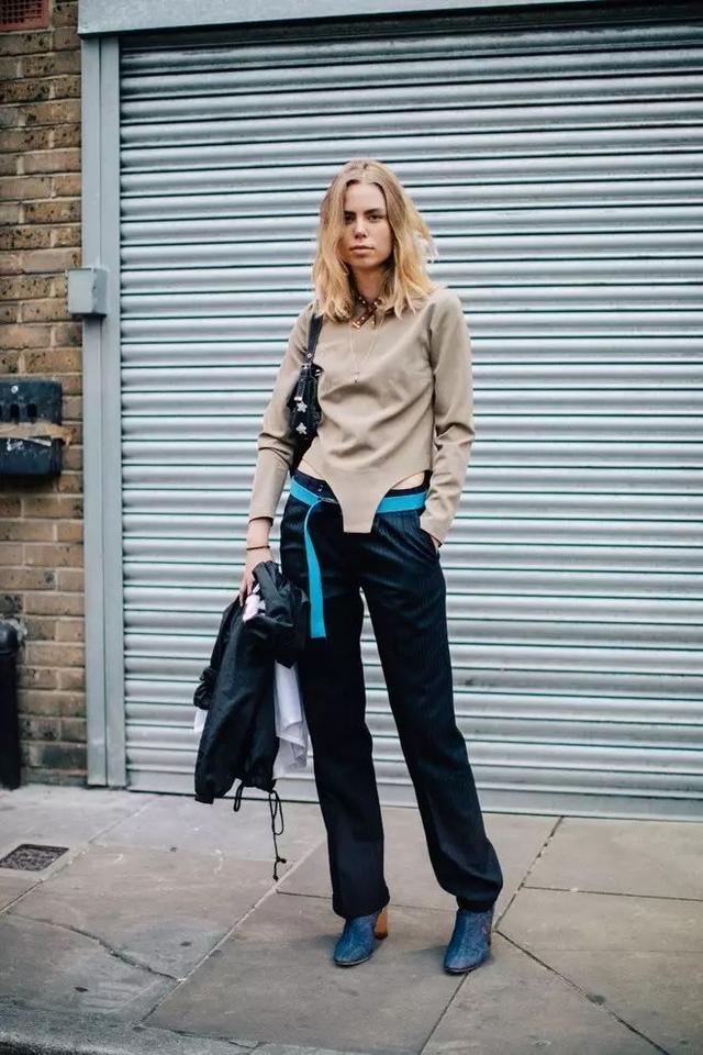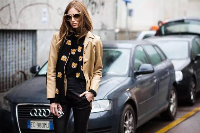 其實很多時候,駝色的單品只用一件就很時髦了。造型大面積的黑色和亮藍色的腰帶吸引了大部分注意力,而駝色又能讓造型更有質感。