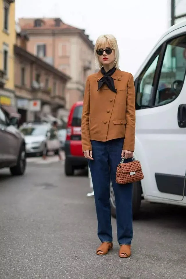 Linda Tol這件深駝色排扣夾克還蠻文藝的,頗有腔調,再加上絲巾的點綴,看頭十足。