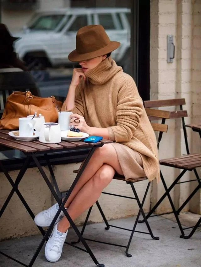 駝色毛衣其實還蠻多見,不過不少女生女生會跳過它首選黑白灰款,但是看多了難免會覺得無聊,駝色毛衣不過分張揚,但也還蠻出挑,備上一件是秋冬的明智之選。
