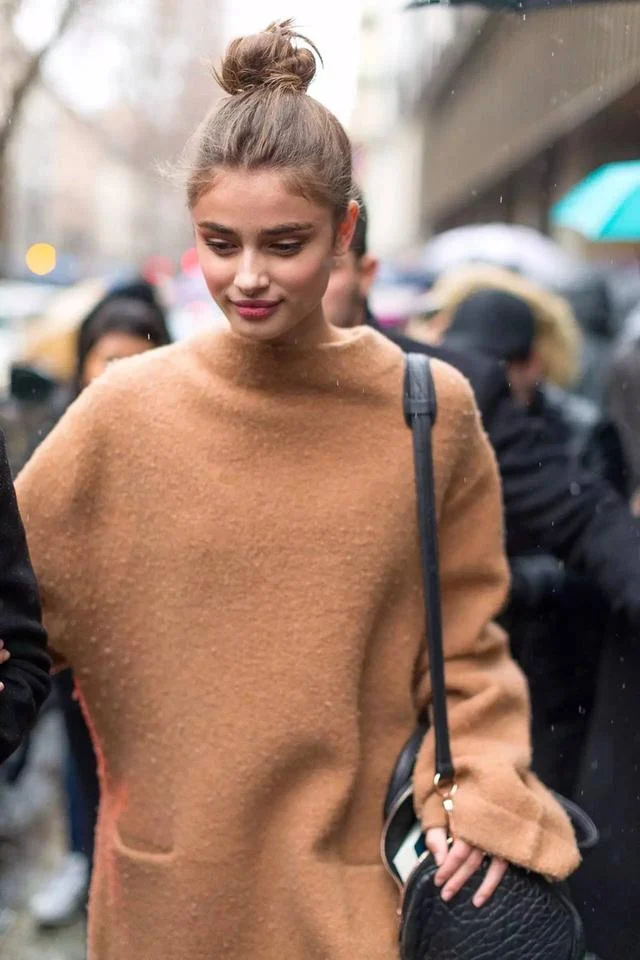 aylor Hill隨意地扎了個丸子頭,把駝色毛衣演繹出青春氣息,俏皮活潑。