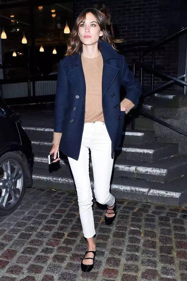 Alexa Chung把駝色毛衣當內搭,和白色牛仔褲呼應柔和幽靜些,與強勢的深藍色西裝外套形成反差,但卻沒有矛盾的衝擊感,可以get起來。