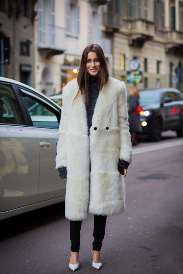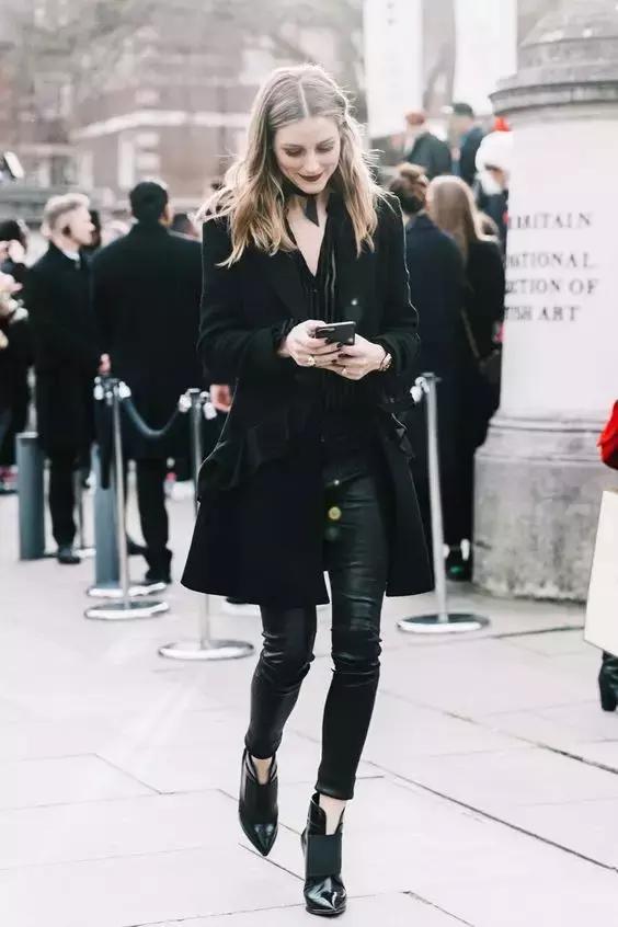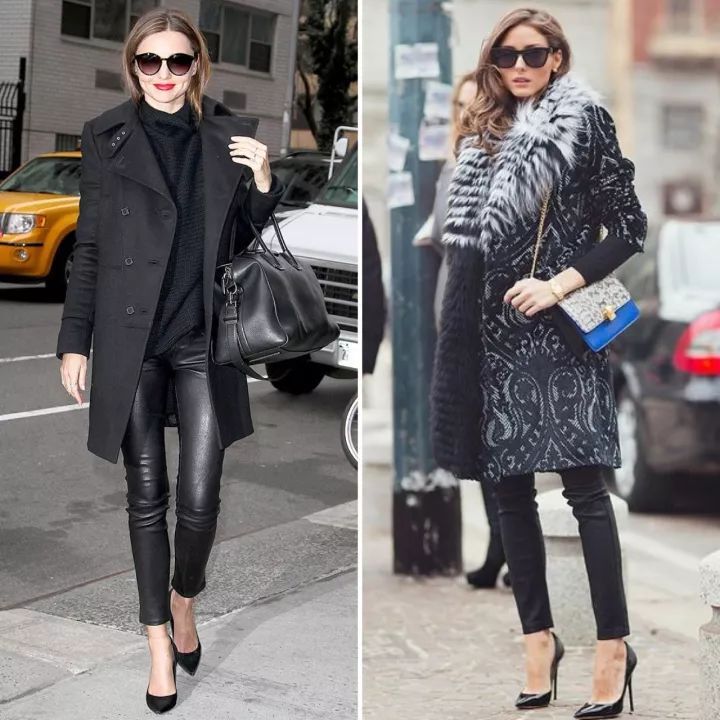 高跟鞋性感,尖頭高跟鞋加緊身黑色褲子優雅又性感。加上皮草外套,雍容華貴但是不會顯得很壕氣。如果沒有皮草可以用羊絨大衣或者風衣替換。