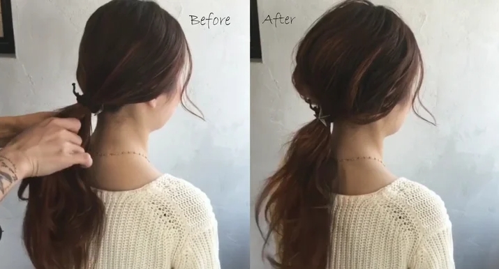 簡單的低馬尾在拉鬆松後也立即很有氣質!要記著把中間和兩旁的頭發一同拉松,慵懶感就是這樣拉出來的啦~