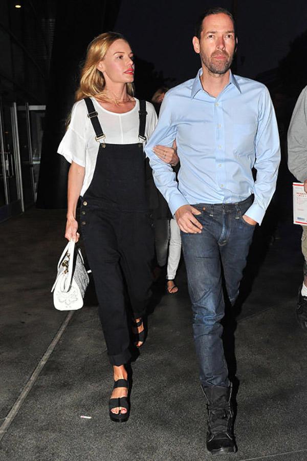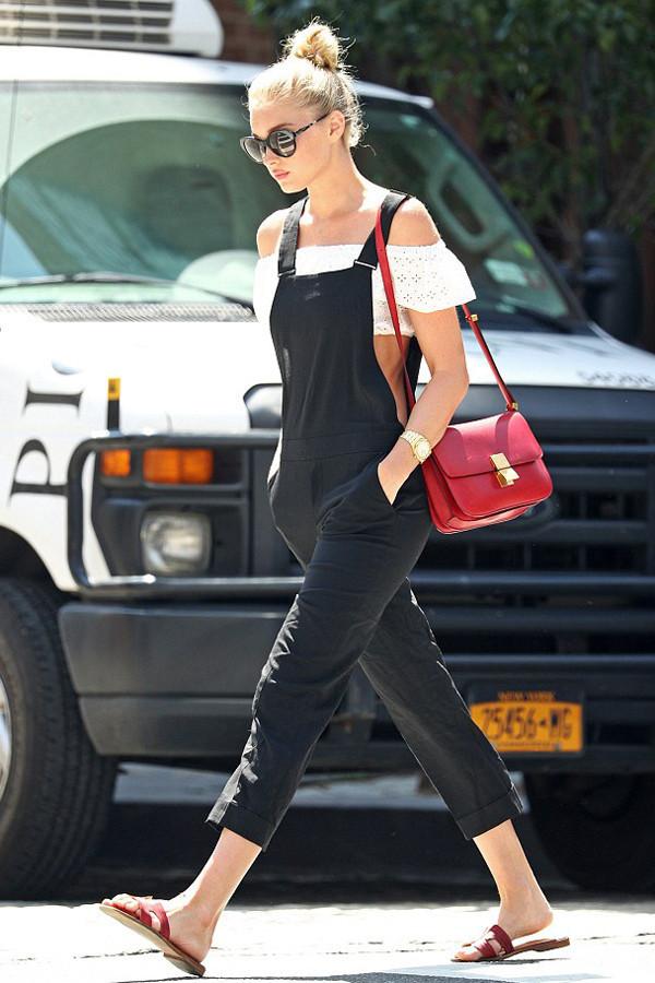 維密天使Lily Aldridge用複古的闊腿背帶褲搭配白色一字領上衣,展現溫柔女人的一面。