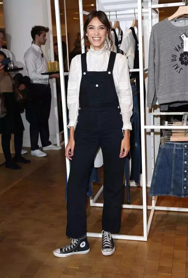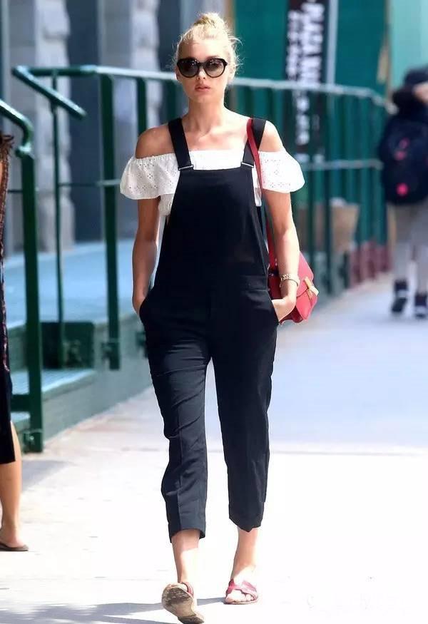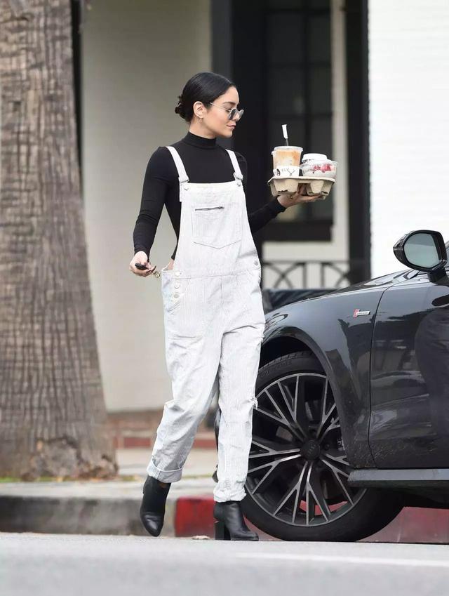 國外明星們似乎都愛上了這款復古高腰款的背帶褲,許多街拍中都能見到。