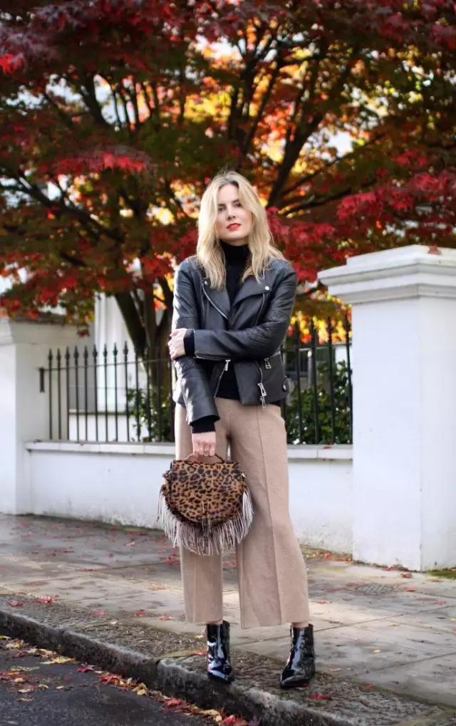 除了一黑到底的搭配,黑色皮夾克其實也很百搭,與駝色闊腿褲組cp能夠為你增添優雅的韻味。