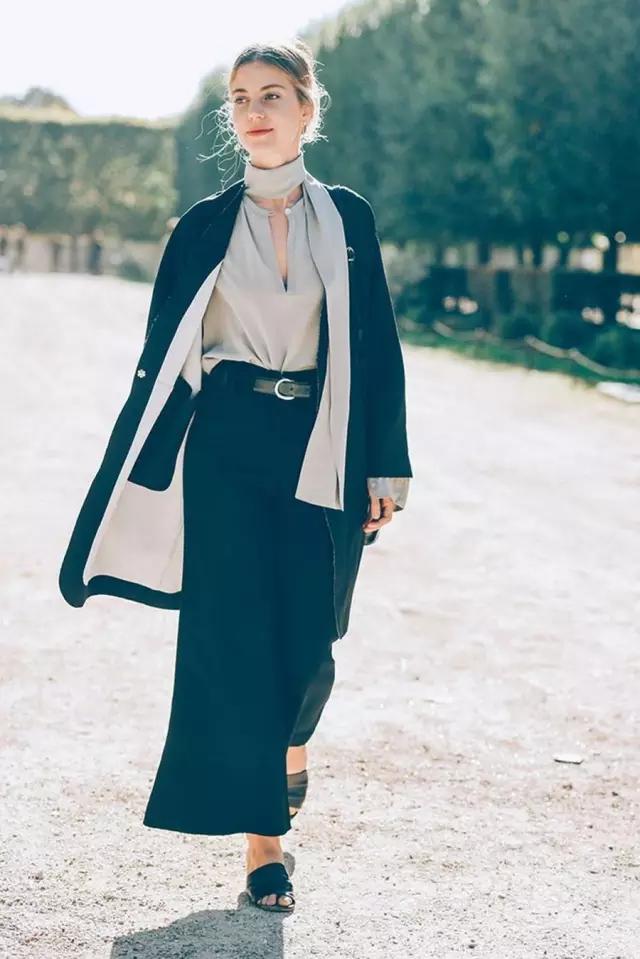長款大衣外加長款闊腿褲有時候會顯得累贅,所以一件中長款的大衣搭配一條高腰闊腿褲,更適合小巧女性的造型。