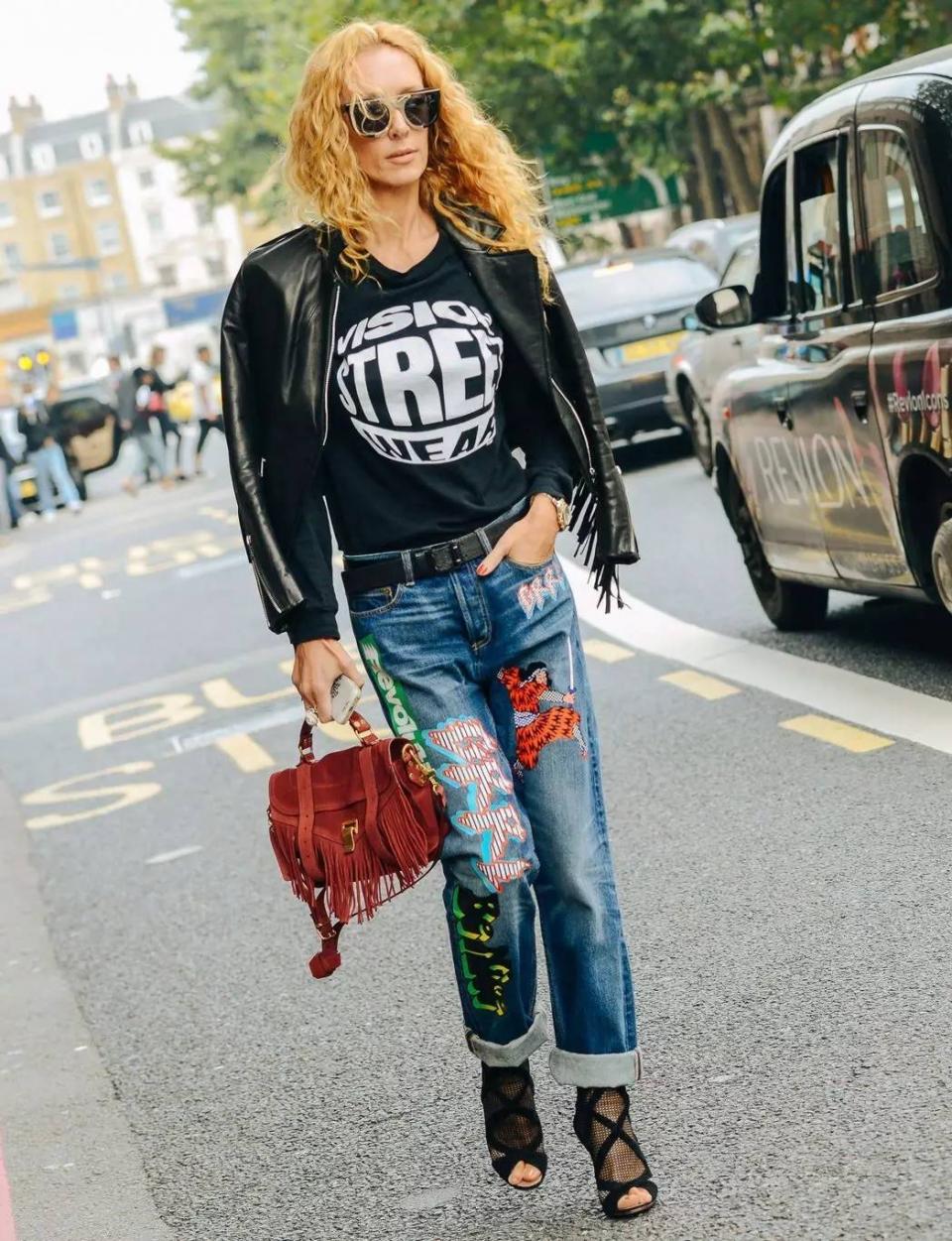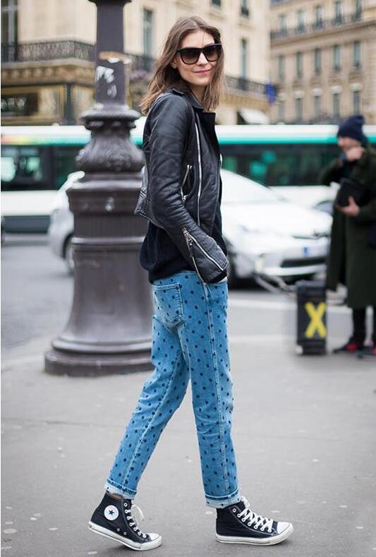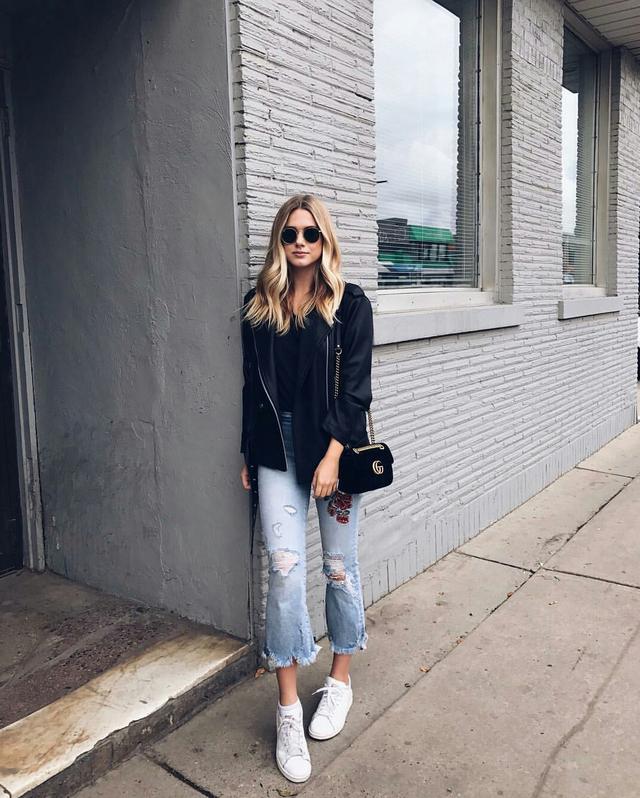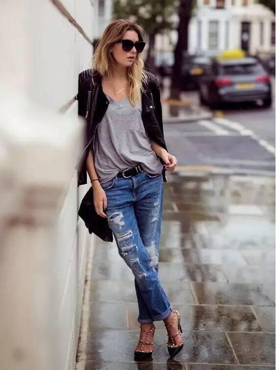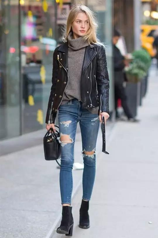 推薦理由:這條破洞小腳牛仔褲,破洞的時尚感中和皮衣的中性,