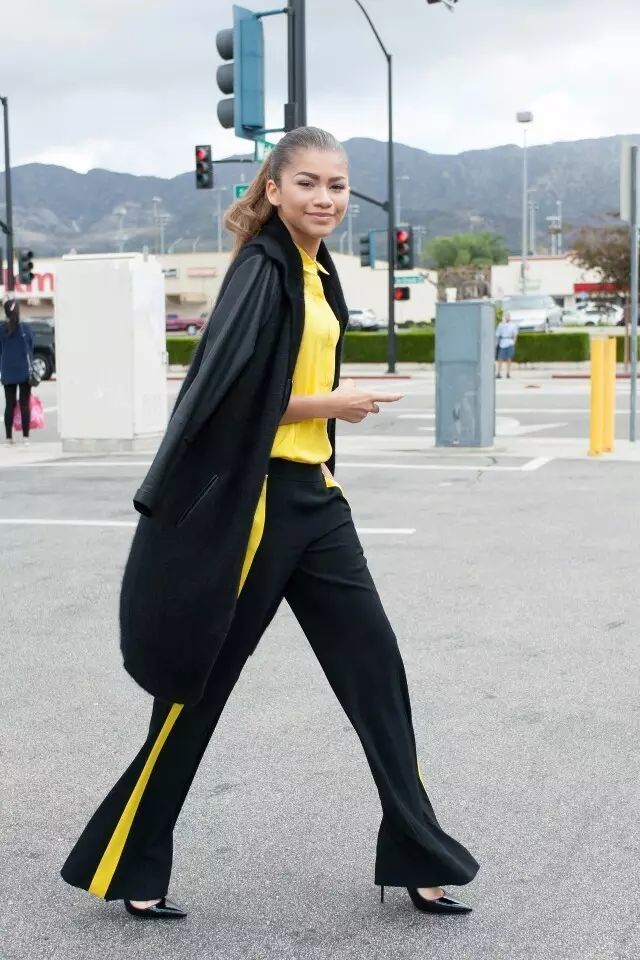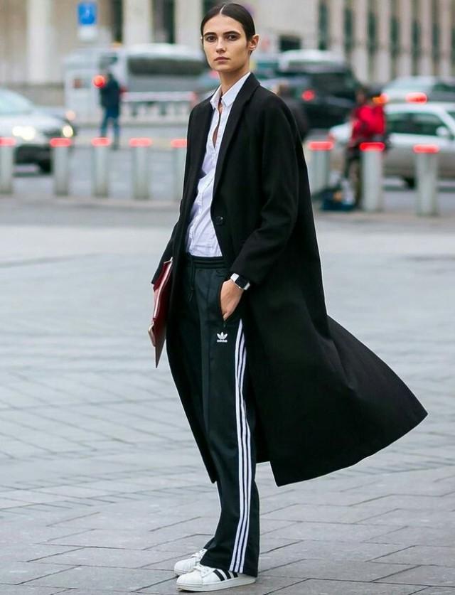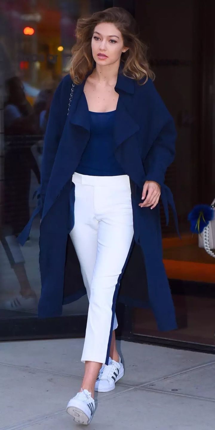 比如像Gigi這樣上衣+大衣同色系更能與褲腿深色條紋相呼應,再搭一雙Superstar 就時尚感滿滿的啦。