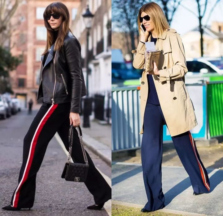 加件風衣、皮衣+側條紋闊腿運動褲+高跟鞋,幹練的氣質,穩重的氣場油然而生。