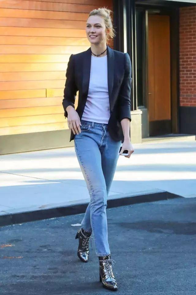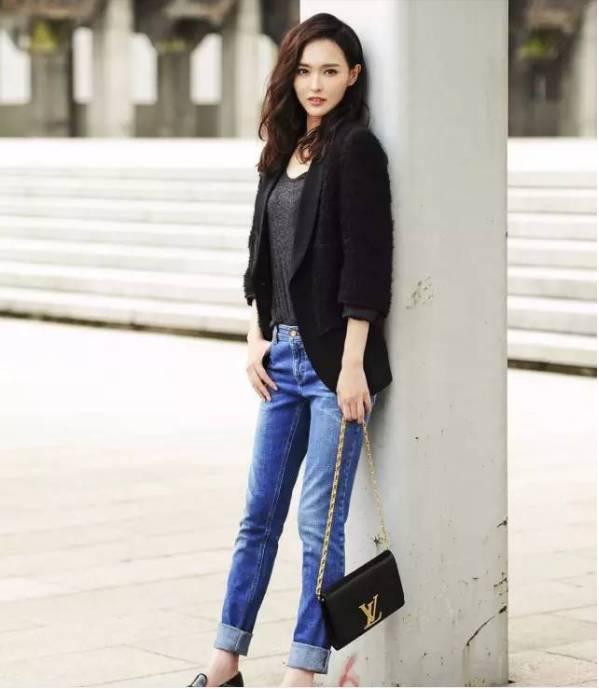 唐嫣用西服外套配牛仔褲,帥氣又不失街頭潮範。
