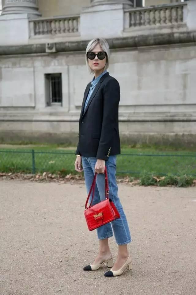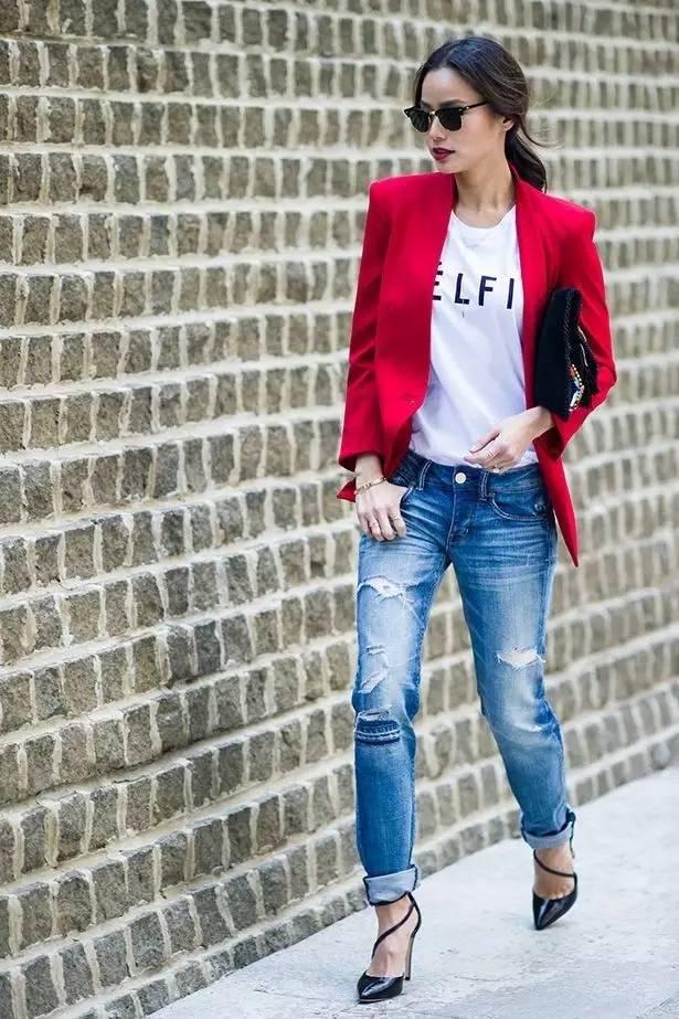正紅色西服外套與牛仔褲是天作之合,驚艷卻又不會過分張揚,讓你輕鬆美成一道迷人街景。