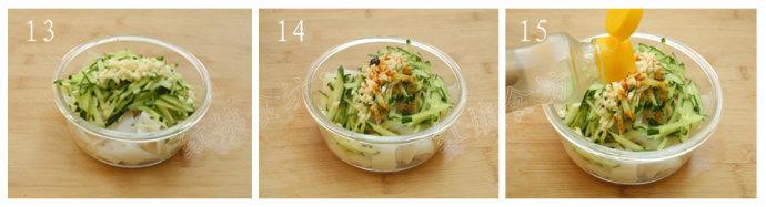 13、黃瓜切絲,蒜瓣剁碎,與切好的涼皮放在一起。