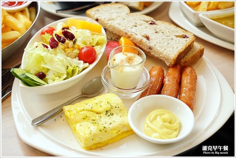▼招牌早餐拼盤(110元),裡頭有雜糧麵包、生菜沙拉、現切水果、私房地瓜、嫩蛋、黑糖小優格等,主餐我們選擇的是德式香腸, 一旁搭配的是黃芥末醬~感覺也是相當豐盛!
