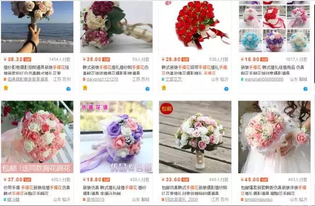 在某寶搜“手捧花”,可以搜出一堆結果。淘寶上賣的花一般是絹花、仿真花,不是真的鮮花。價格在幾十塊到幾百塊不等。