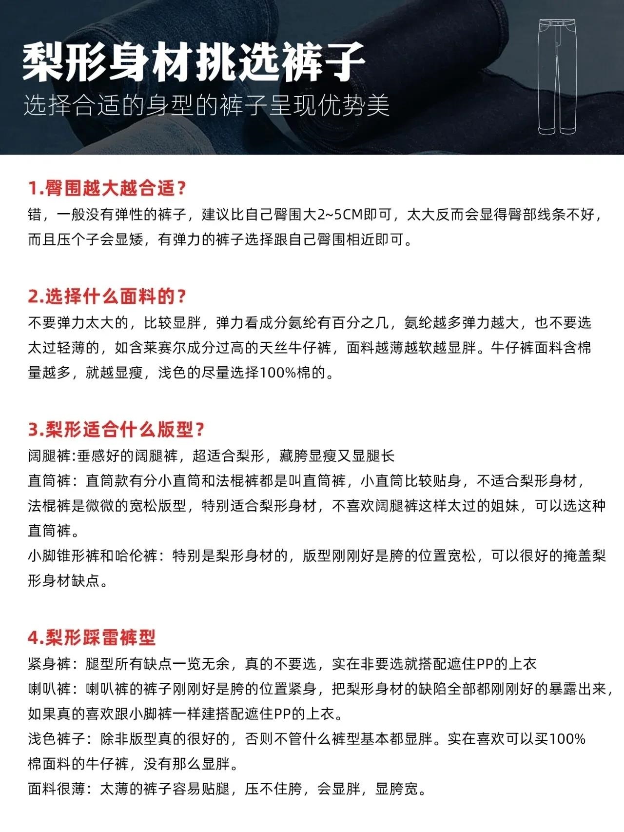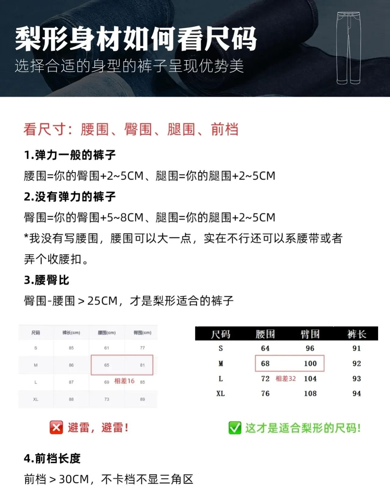腿粗的梨形姑娘,在選擇牛仔褲的時候,首先盡量避免太過於緊身的褲型。